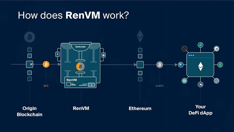 Ren permite el intercambio descentralizado y sin necesidad de confianza de criptomonedas entre cadenas de bloques mediante su plataforma central, la Máquina Virtual Ren (RenVM). RenVM lo hace mediante una red de “Darknodes” que proporciona la potencia de procesamiento necesaria para identificar y procesar órdenes de criptomonedas entre cadenas.